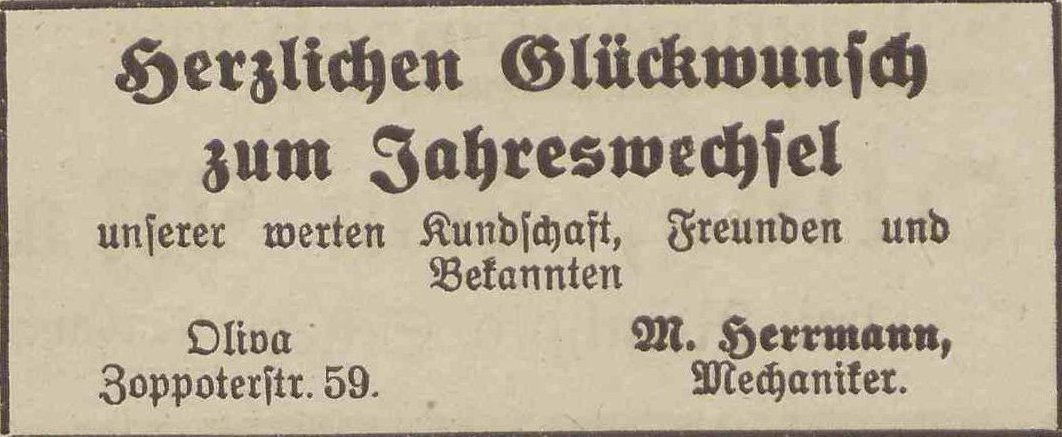 Max Herrmann. Podziękowania noworoczne, Olivaer Zeitung nr 306 z 31. 12. 1920.