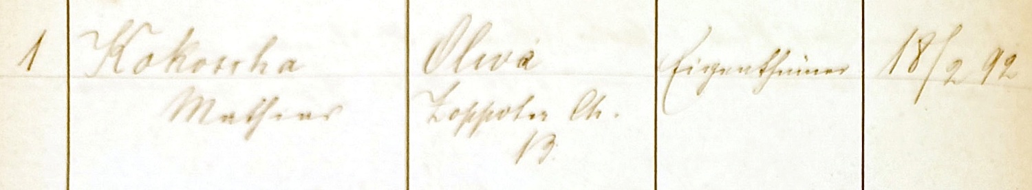 Mathias Kokoscha. Baukonholle Oliva IXX. Wpis z 18. 02. 1892. Przekazała Grażyna Niemyjska.