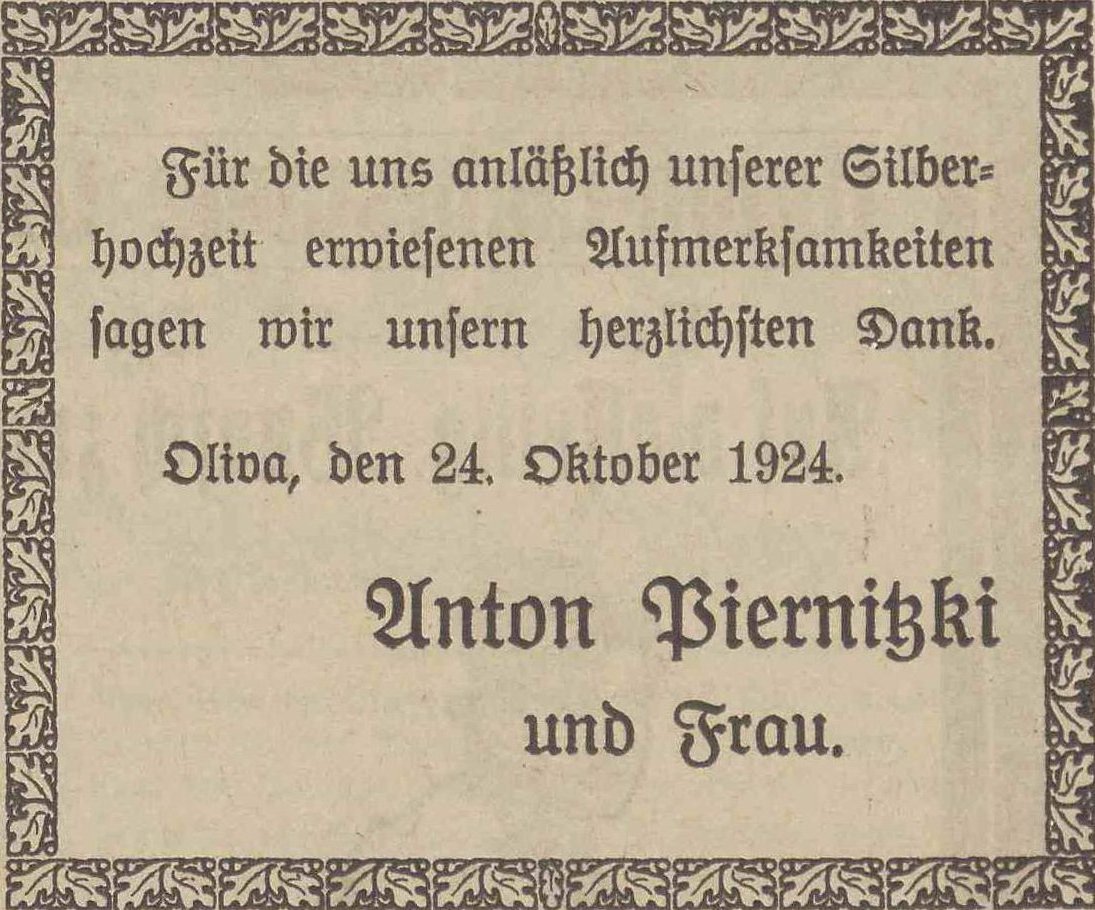 Anton Piernitzki. 25-ta rocznica ślubu (srebrna). Olivaer Zeintung nr 251 z 25. 10. 1924 r.