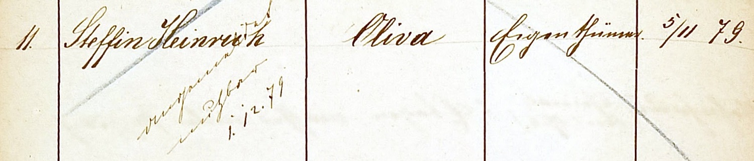 Steffin Keinrusch. Baukonholle Oliva IXX. Wpis z 05. 11. 1879. Przekazała Grażyna Niemyjska.