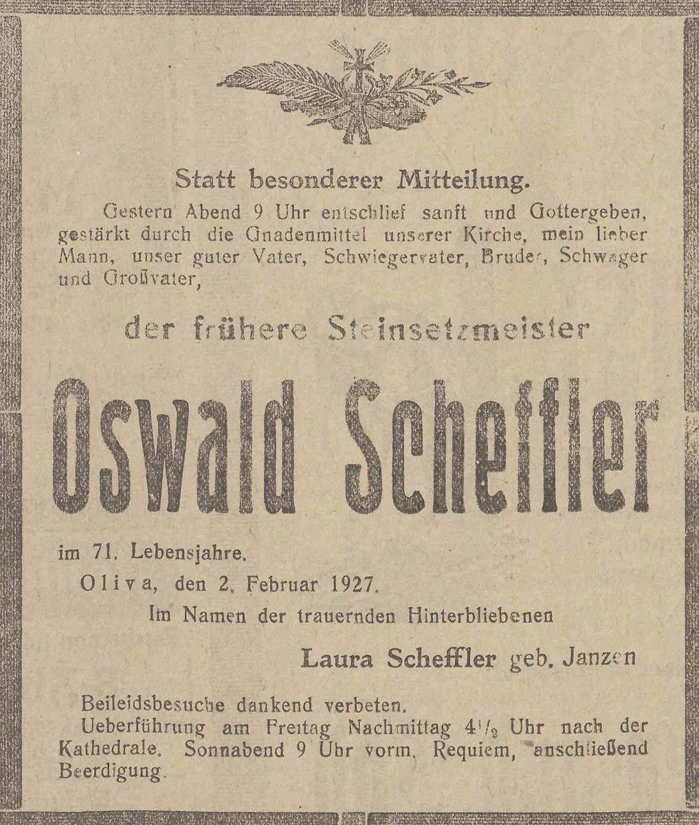Oswald Scheffler. Olivaer Zeintung nr 29 z 04. 02. 1927 r.