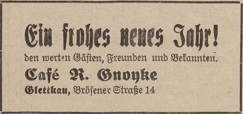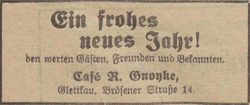 Robert Gnoyke, Café, Glettkau. Podziękowania noworoczne, Olivaer Zeitung nr 306 z 31. 12. 1928.