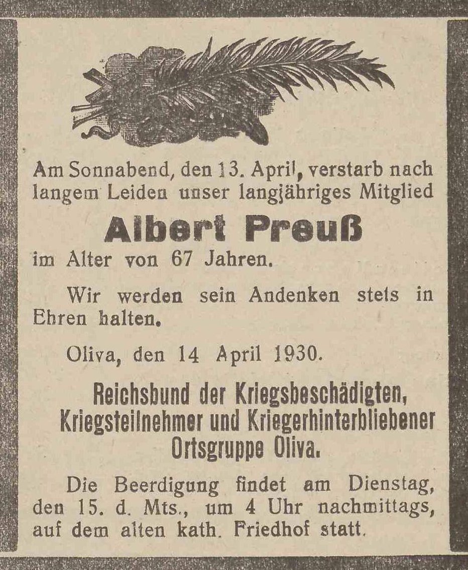 Albert Preuß. Olivaer Zeintung nr 88 z 14. 04. 1930 r.