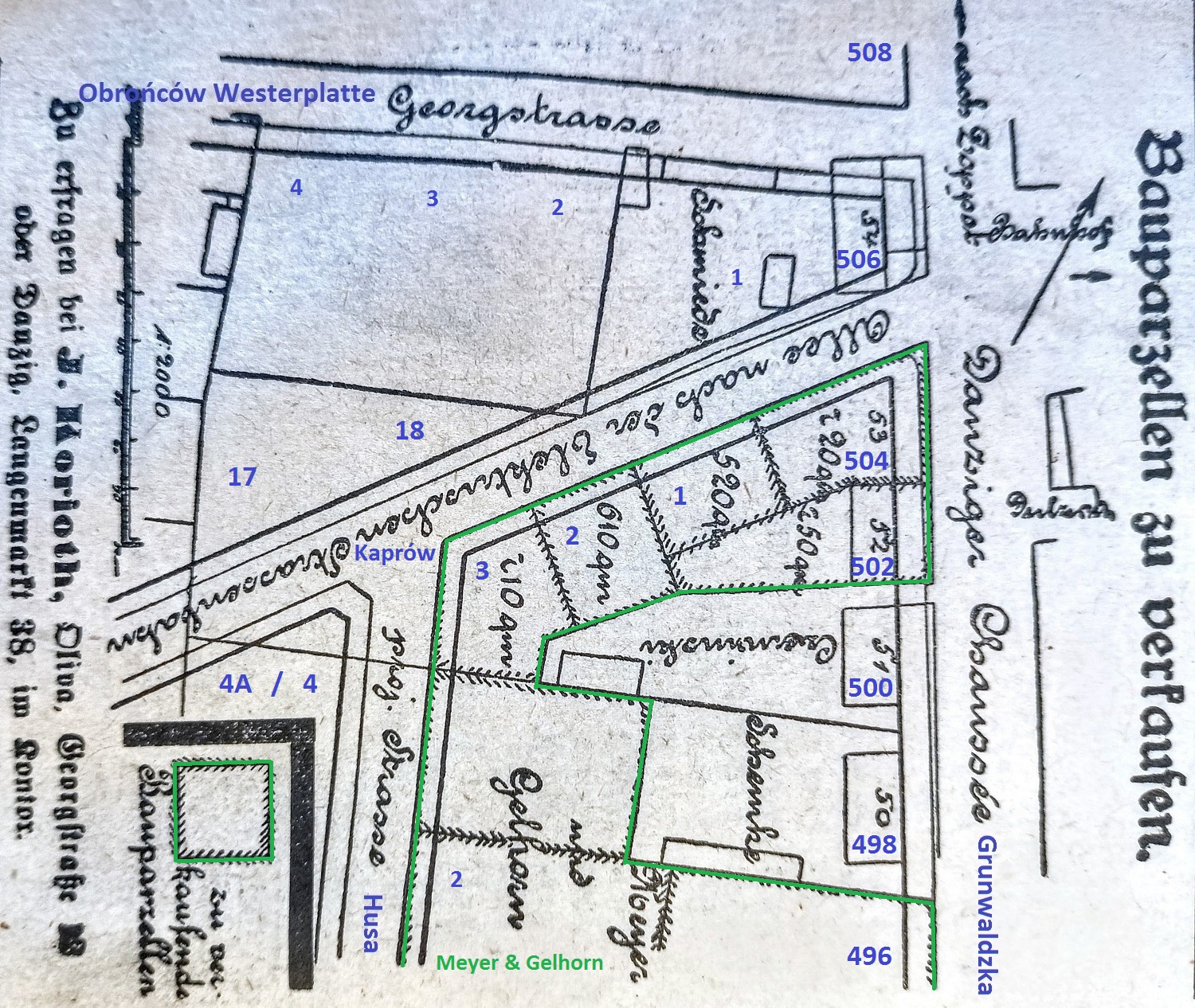 Plan rozbudowy Oliwy opublikowany w Olivaer Nachrichten nr 48 z 16. 07. 1906 roku. Na zielono zaznaczono działki należące do spółki budowlanej Meyer & Gelhorn. Przekazała Grażyna Niemyjska.