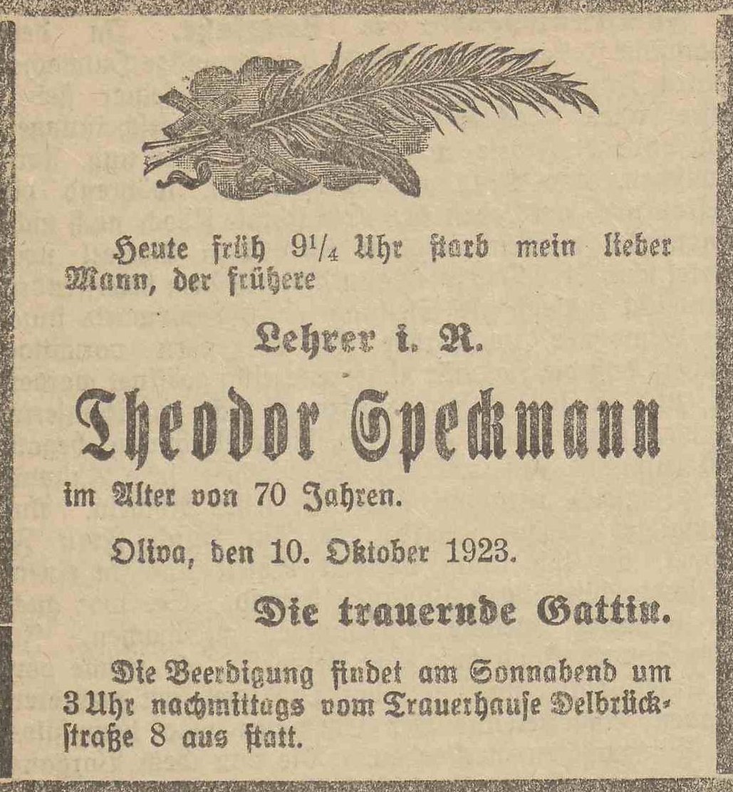 Theodor Speckmann. Olivaer Zeintung nr 238 z 12. 10. 1923 r.