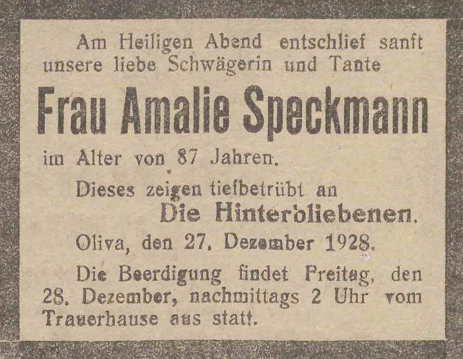 Amalie Speckmann. Olivaer Zeintung nr 303 z 27. 12. 1928 r.