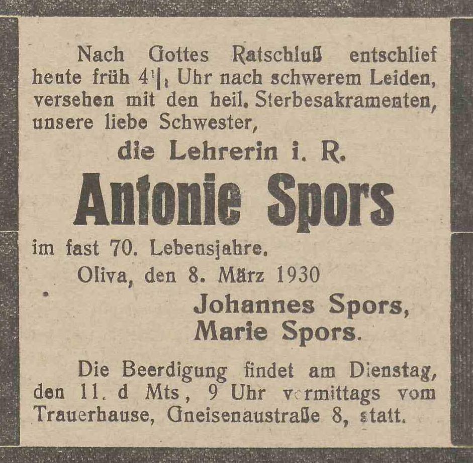 Antonine Spors. Johannes Spoors. Marie Spors. Olivaer Zeintung nr 57 z 08. 03. 1930 r.