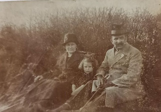 Zdjęcie przedstawia Antoniego, Teresę i małą Jadwigę już po przeprowadzce ze Starych Szkotów do Oliwy. Ujęcie wykonano na tyłach domu przy Kaprów 8 ok. 1927 r.