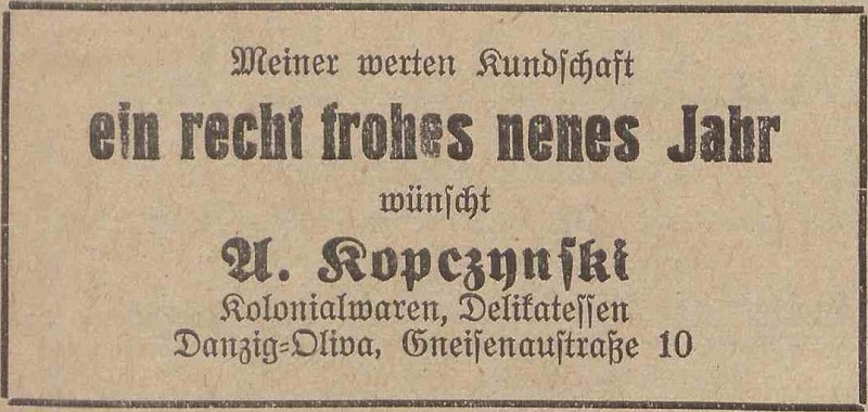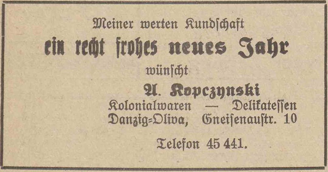 Anton Kopczynski, Kolonialwaren, Delikatessen. Podziêkowania noworoczne, Olivaer Zeitung nr 305 z 31. 12. 1931.