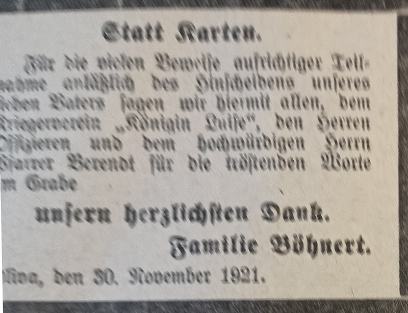 Therese Böhnert zd Kalinowski. Gustav Böhnert. Danziger Kreis-Zeitung 1921. Przekaza³a Gra¿yna Niemyjska.
