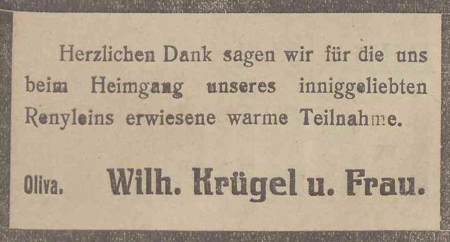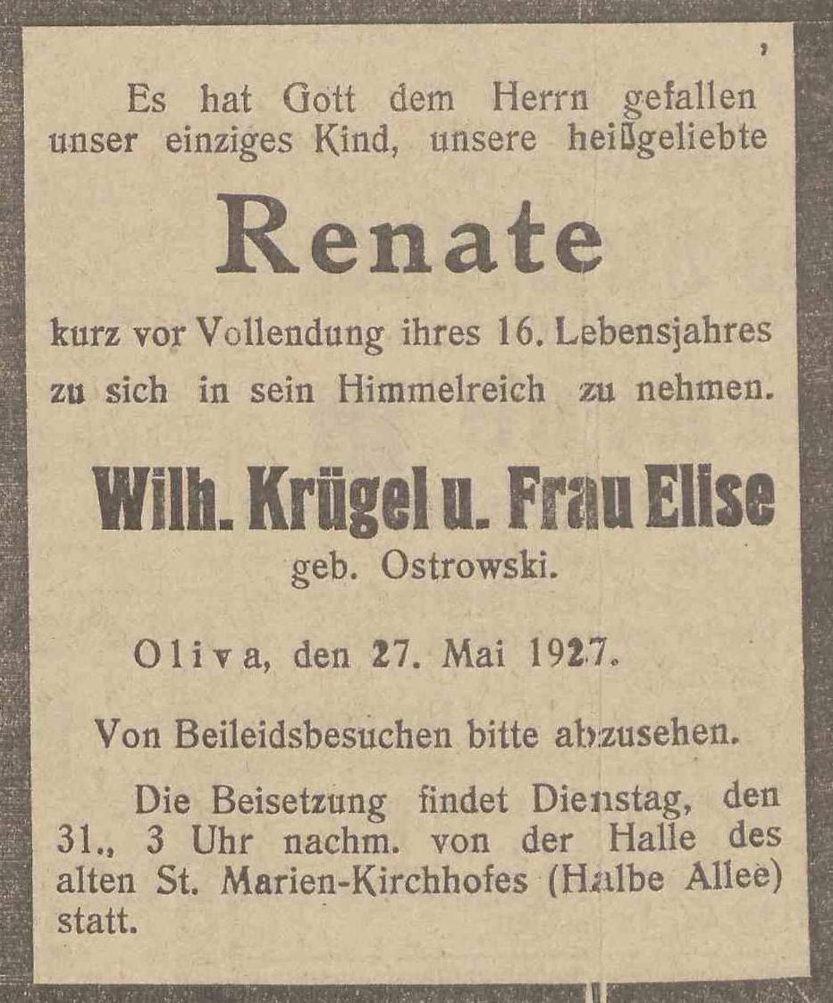 Renate Krügel. Wilhelm Krügel. Elise Krügel zd. Ostrowski. Olivaer Zeintung nr 123 z 28. 05. 1927 r.