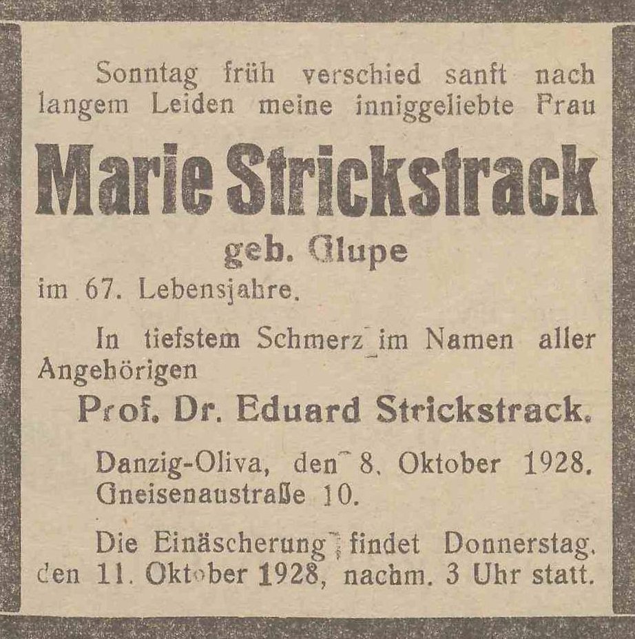 Marie Strickstrack zd. Glupe. Eduard Strickstrack. Olivaer Zeintung nr 237 z 08. 10. 1928 r.