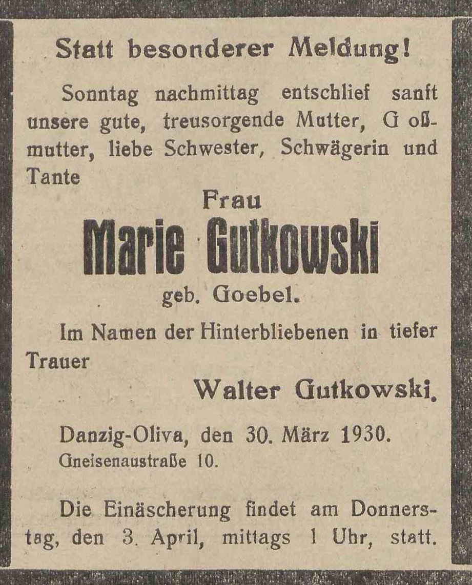 Marie Gutkowski zd. Goebel. Walter Gutkowski. Olivaer Zeintung nr 78 z 02. 04. 1930 r.
