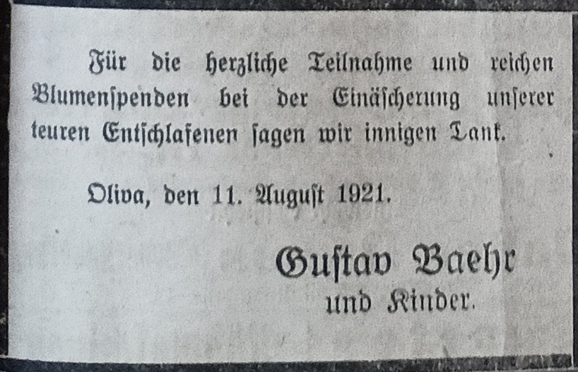 Berta Baehr zd. Neumann. Gustav Baehr. Danziger Kreis-Zeitung 1921. Przekazała Grażyna Niemyjska.