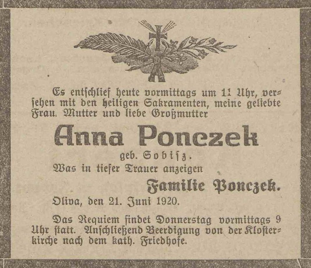 Anna Ponczek zd. Sobisz. Olivaer Zeintung nr 143 z 22. 06. 1920 r.