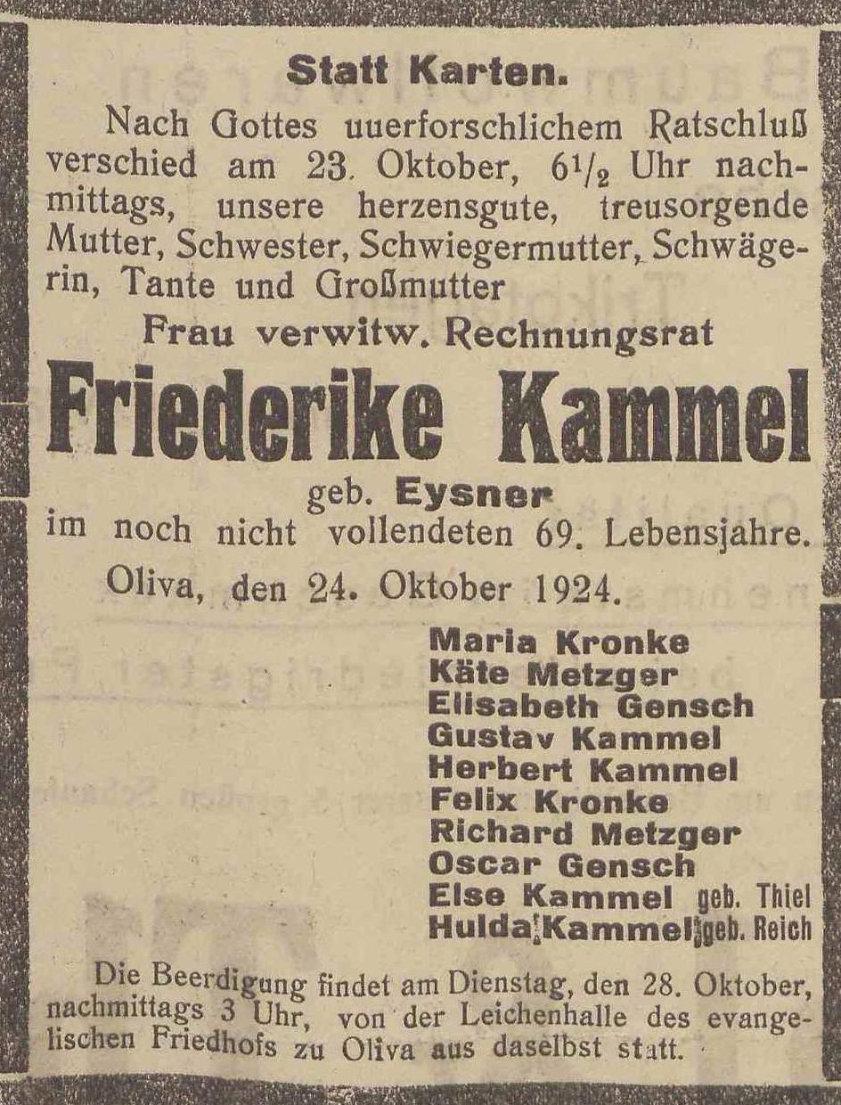 Friderike Kammel. Maria Kronke. Käte Metzger. Elisabeth Gensch. Gustav Kammel. Herbert Kammel. Felix Kronke. Richard Metzger. Oscar Gensch. Else Kammel zd. Thiel. Hulda Kammel zd. Reich. Olivaer Zeintung nr 252 z 27. 10. 1924 r.