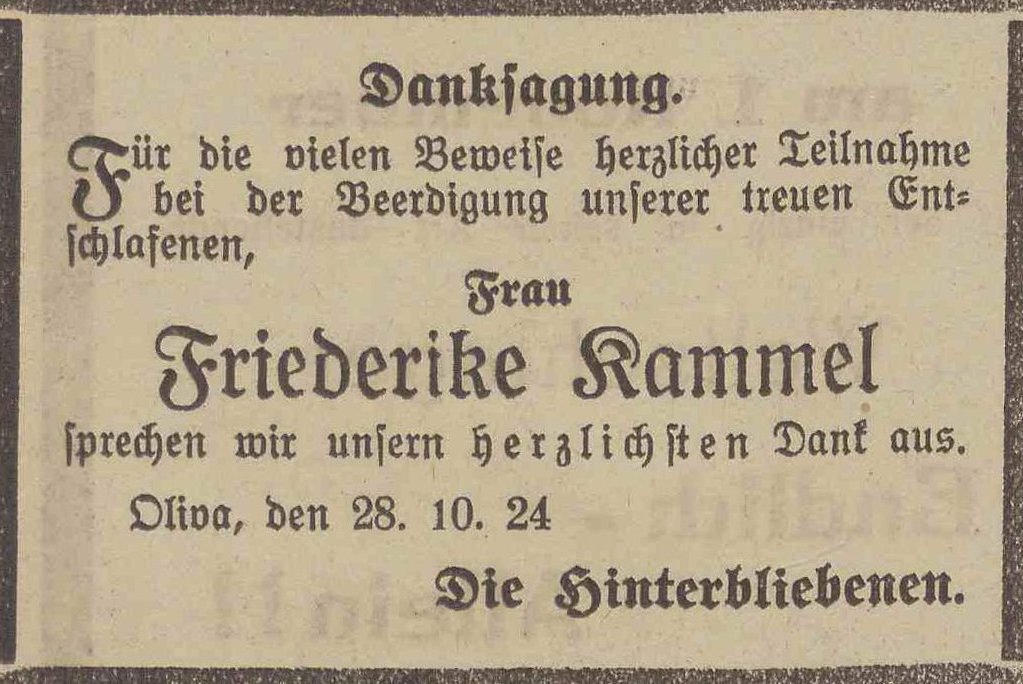 Friderike Kammel. Olivaer Zeintung nr 252 z 27. 10. 1924 r.