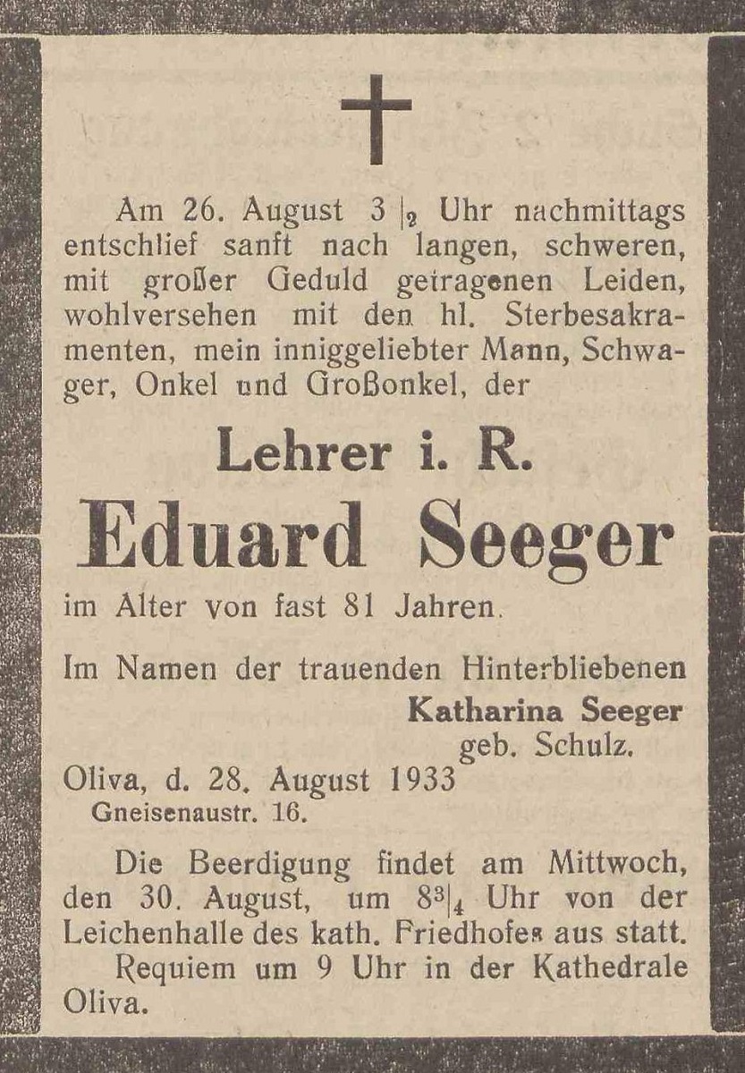 Eduard Seeger. Katharina Seeger zd. Schulz. Danzig-Olivaer Zeintung nr 201 z 28. 08. 1933 r.