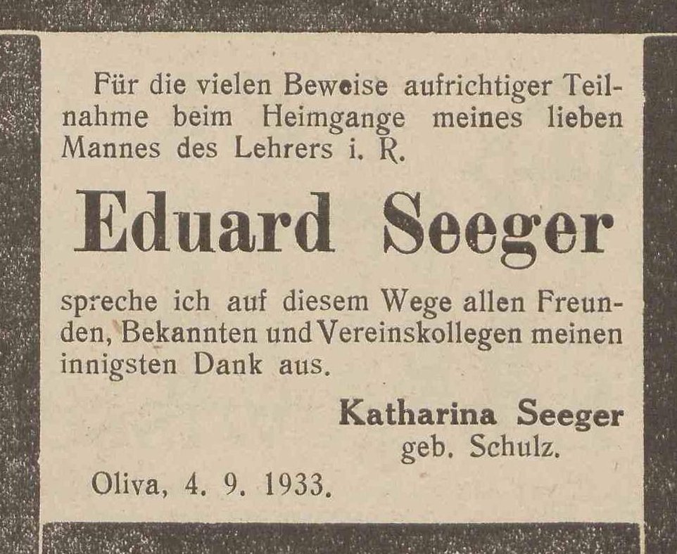 Eduard Seeger. Katharina Seeger zd. Schulz. Danzig-Olivaer Zeintung nr 207 z 04. 09. 1933 r.