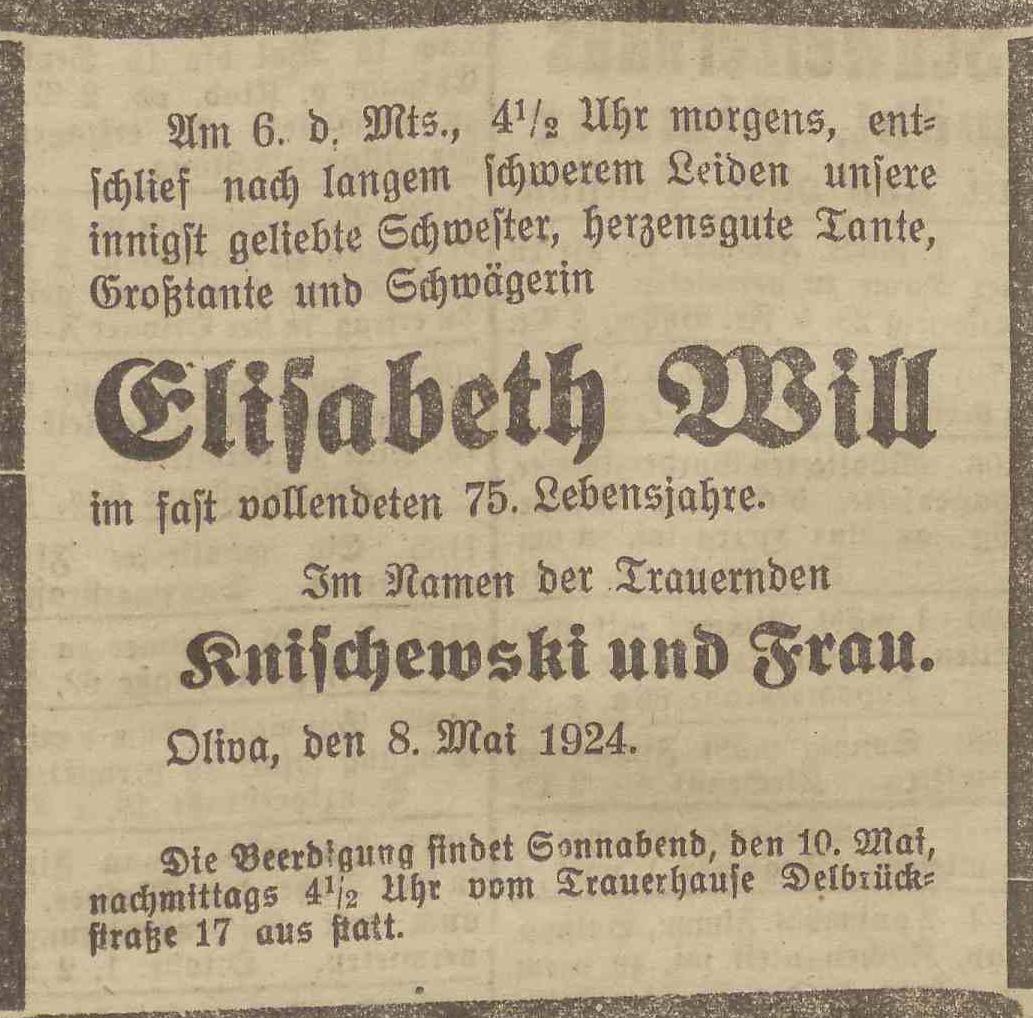 Elisabeth Will. Knischewski. Olivaer Zeintung nr 107 z 08. 05. 1924 r.