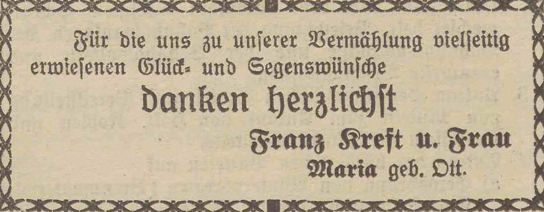 Franz Kreft. Maria Kreft zd. Ott. Olivaer Zeintung nr 270 z 17. 11. 1924 r.