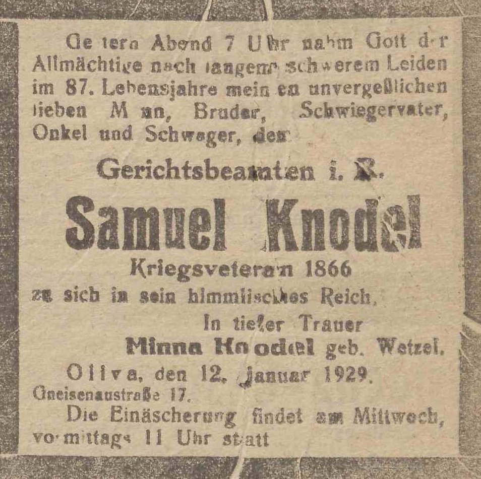 Samuel Kondel. Maria Kondel zd. Wetzel. Olivaer Zeintung nr 10 z 12. 01. 1929 r.