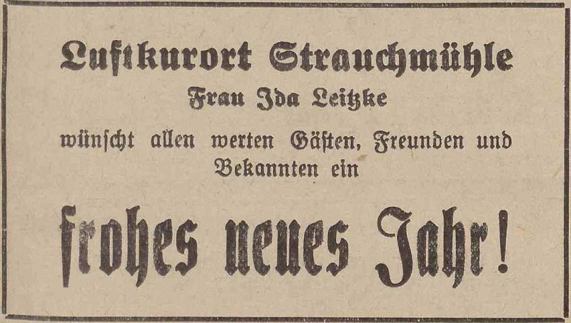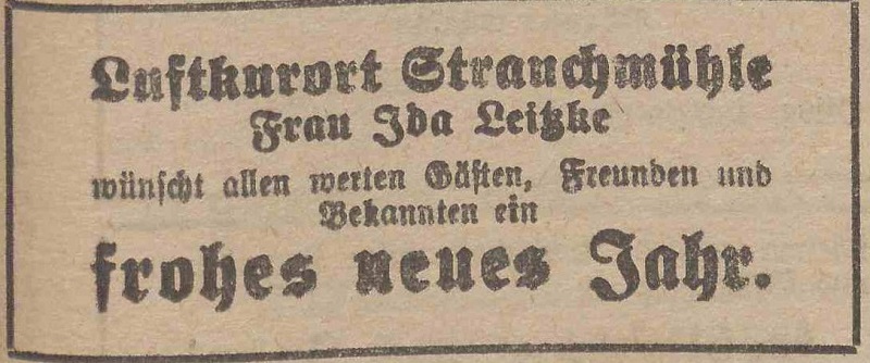 Ida Lietzke, Luftkurort Strauchmüchle. Podziękowania noworoczne, Olivaer Zeitung nr 306 z 31. 12. 1928.