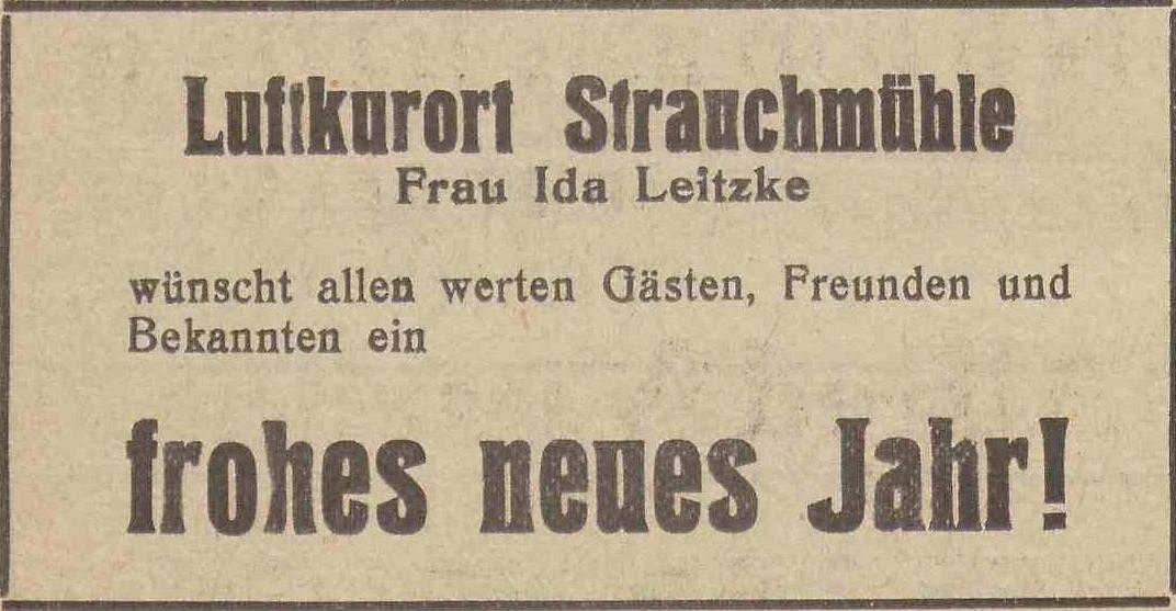 Ida Lietzke, Luftkurort Strauchmühle. Podziękowania noworoczne, Olivaer Zeitung nr 305 z 31. 12. 1929.