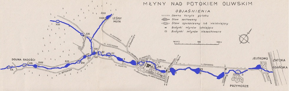 MŁYN XXI. Przy drodze do Owczarni nad małym potoczkiem, dopływem Potoku Oliwskiego. Od XVI w. był tu młyn prochowy, czynny do 1882 r. Doprowadzono tu sztucznym kanałem jeszcze jeden potoczek z sąsiedniej doliny. Zachował się osuszony staw, przerwana tama, i zniszczony przepust. Budynek młyna ryglowy, piętrowy, z XIX w., przerobiony na budynek mieszkalny. W sąsiedztwie parterowy domek murowany z ok. 1800 r.; obydwa domy - ul. Kościerska 10. Na zachód od drogi łączącej młyn XXI z młynem XV jeszcze ok. 1800 r. znajdował się staw, obecnie osuszony; śladów tamy i młyna brak.