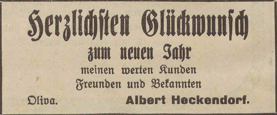 Albert Heckendorf. Podziękowania noworoczne, Olivaer Zeitung nr 306 z 31. 12. 1920.