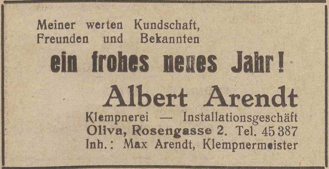 Albert Arendt, Klempenrei, Inhaber Max Arenst. Podziękowania nowo-roczne, Olivaer Zeitung nr 305 z 31. 12. 1931.