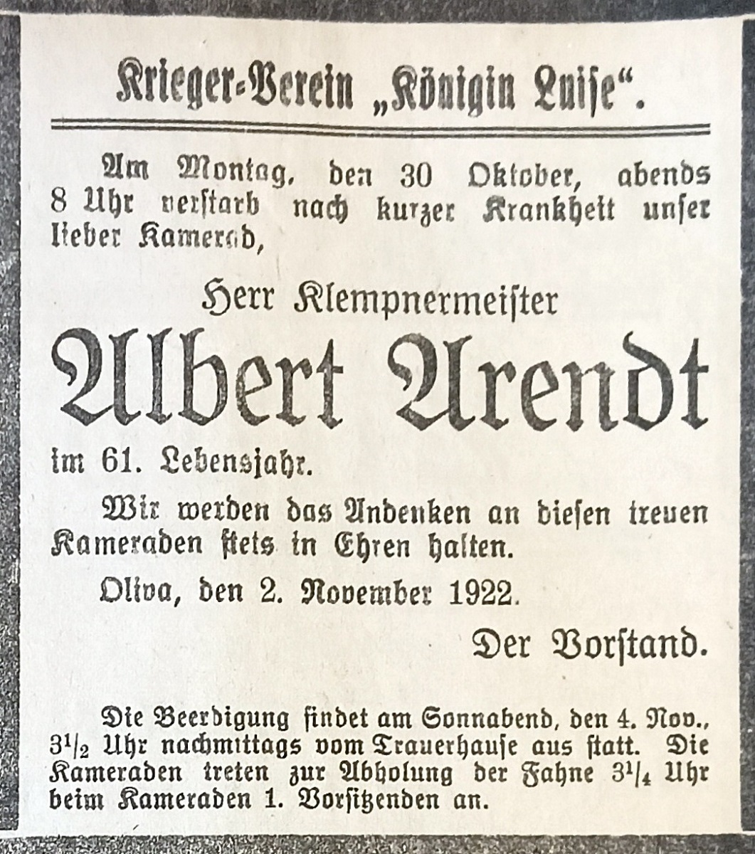 Albert Arendt. 02. 11.1922. Danziger Kreis-Zeitung 1922. Przekazała Grażyna Niemyjska.