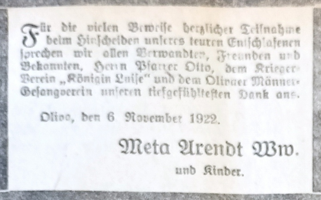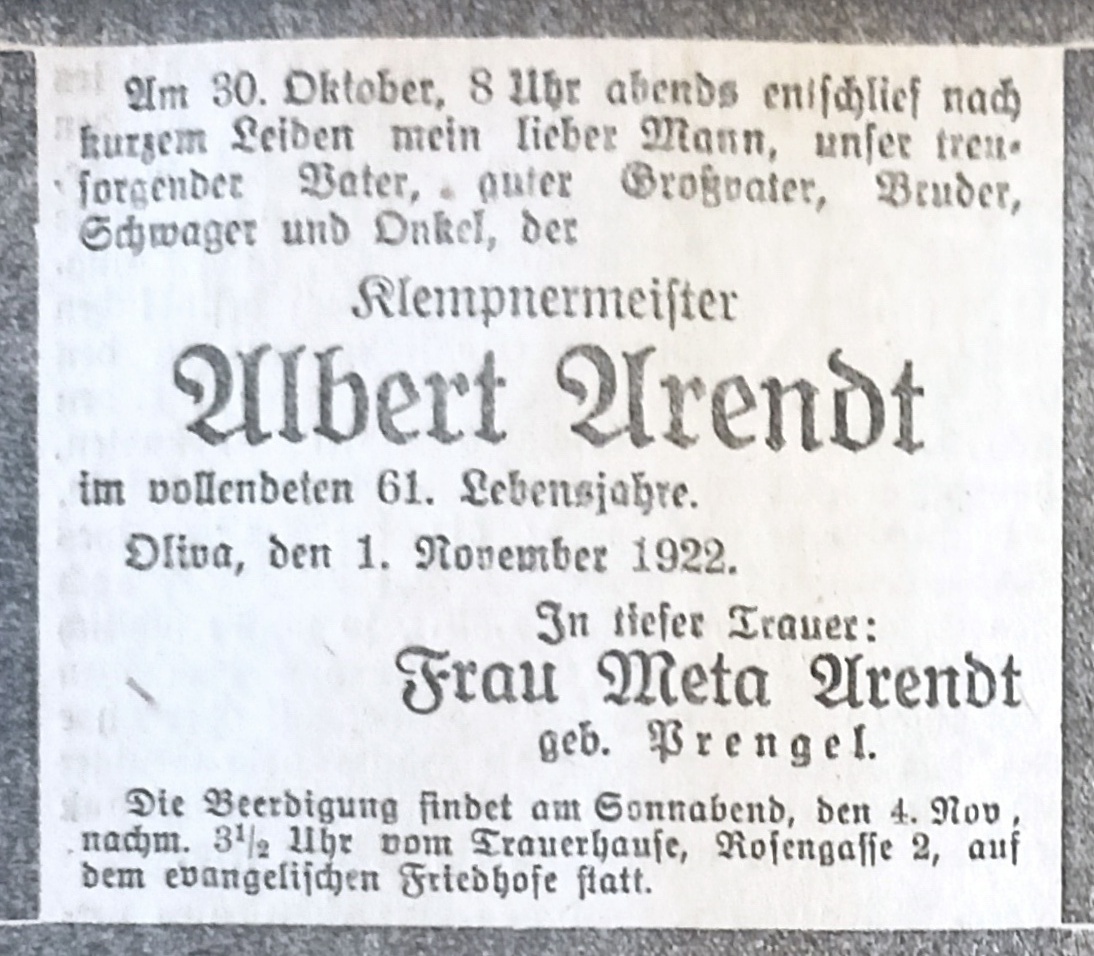 Albert Arendt. Meta Arendt zd. Prengel. 01. 11.1922. Danziger Kreis-Zeitung 1922. Przekazała Grażyna Niemyjska.