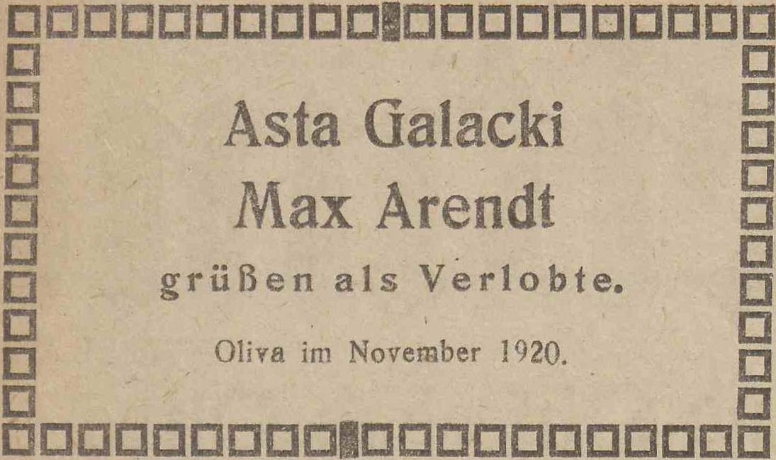 Asta Galacki. Max Arendt. Olivaer Zeintung nr 267 z 13. 11. 1920 r.