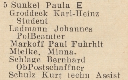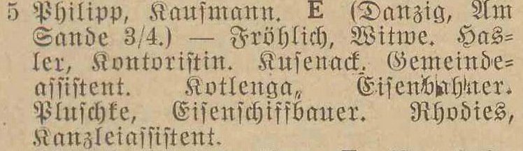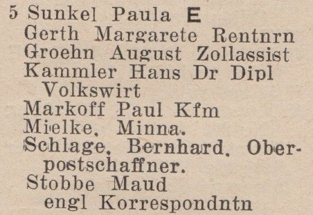 1916: Ewald, Bauunternehmer (właściciel - mieszkał przy ul. Seestraße 12). Dittmer, Wirtin. Fehler, Pensions-Inhaberin. Fröhlich, Kanzlei-Sekretär. Hasler, Privatiere. Kersten, Rentner. Melber, FräuTein. Rohdies, Kanzleibeamter. Rohdies, Witwe. Wisniewski, Hedwig u. Margarete, Buchhalterinnen. Wisniewski, Lehrer-Witwe.