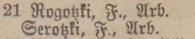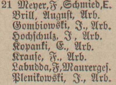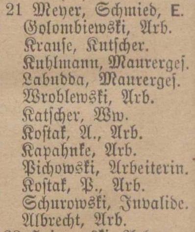 1916: Meyer, Rentenempfänger (właściciel - mieszkał pod nr 36). Bluhm, Arb. Dahms, Arb. Delke, Arb. Hebel, Arbeiter. Hebel, Invalide. Kitowski, Maurer. Kitowski, Zimmerer. Litzbarski, Anton und Karl, Arbeiter. Litzbarski, Kutscher. Naschewski, Arbeiter. Pichowski, Schlosser. Pichowski, Arbeiter. Schurowski, Arbeiter. Wroblewski, Arbeiter. Wroblewski, Witwe.