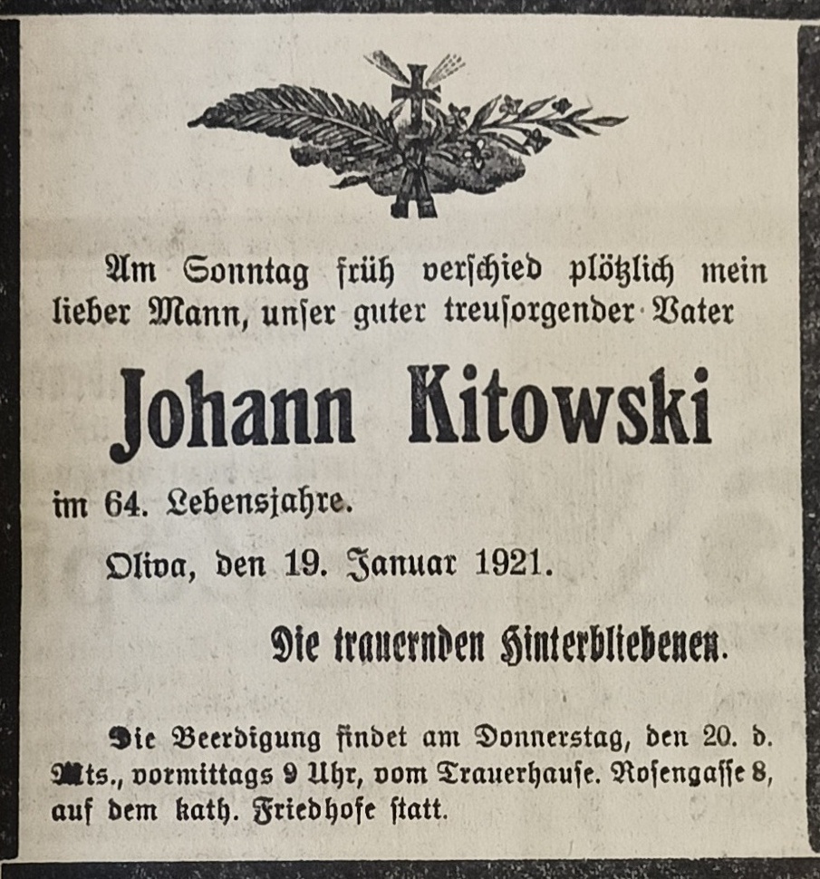 Johan Kitowski. Rosengasse 8. Danziger Kreis-Zeitung 1921. Przekazała Grażyna Niemyjska.