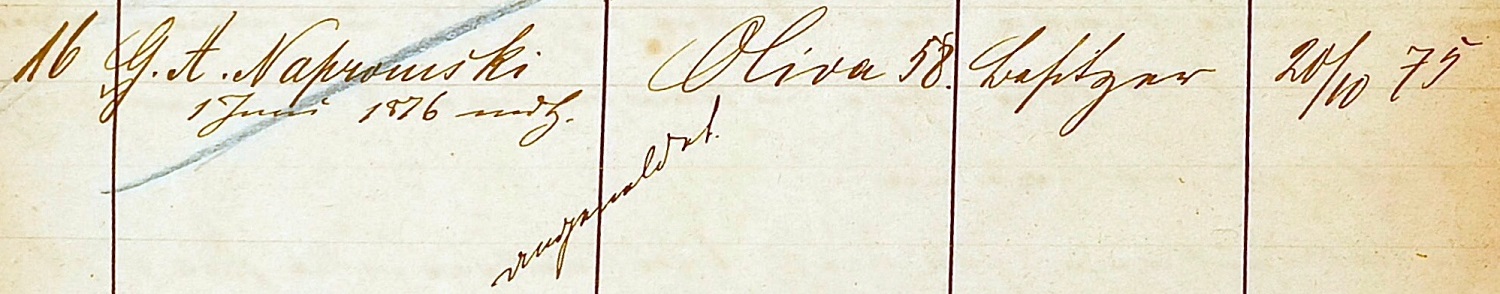 G. A. Napromski, Oliva 58, Besitzer. Baukonholle Oliva IXX. Wpis z 20. 10. 1875. Przekazała Grażyna Niemyjska.