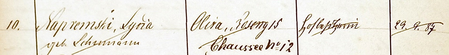 Lydia Napromski zd. Schumann. Baukonholle Oliva IXX. Wpis z 29. 09. 1887. Przekazała Grażyna Niemyjska.