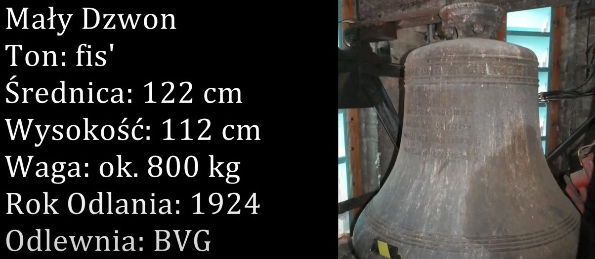 Mały Dzwon. Imię: brak danych. Materiał: staliwo. Ton: fis’. Średnica: 122 cm. Wysokość (z koroną): 112 cm. Wysokość korony: 10 cm. Waga: ok. 800 kg. Dekoracje (od góry): Korona płytowa: 2 półwałki, Inskrypcje na szyi: - (zapisana niemiecko-gotycką czcionką (oprócz oznaczenia biblijnego)): FRIEDE SEI MIT ALLEN, Luc. 24,36 - z drugiej strony (zwykłą czcionką): Geg. v. Bochumer Verein, Bochum 1924. 2 półwałki: Inskrypcja na płaszczu (zapisana niemiecko – gotycka czcionką): Zur friedenheimat Rut ich die Getster~Gelert uns ins leben Das Todes Meister. 4 półwałki. Rok Odlania: 1924. Odlewnia: Bochumer Verein.