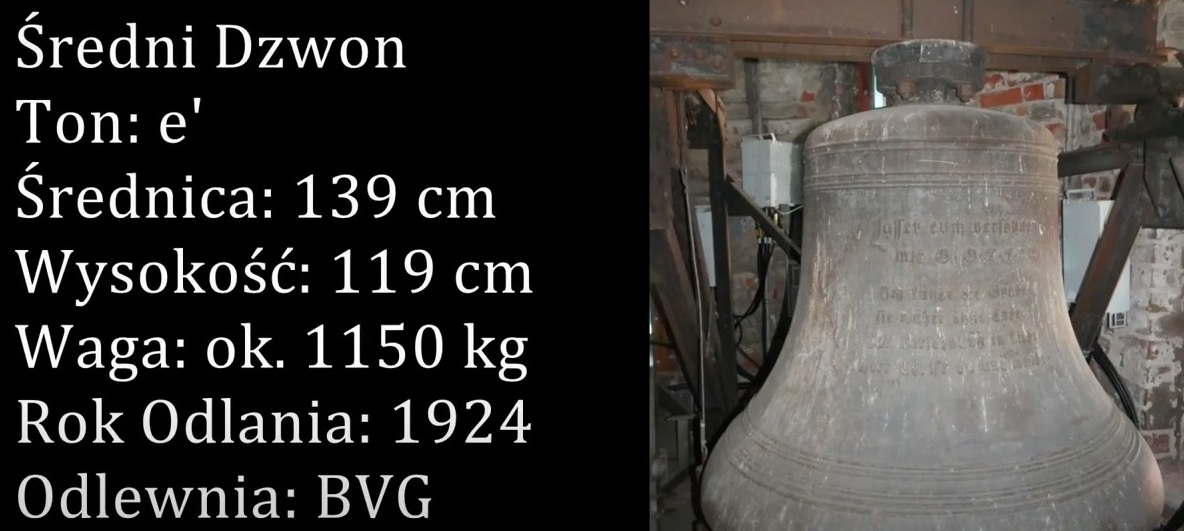 Średni Dzwon. Imię: brak danych. Materiał: staliwo. Ton: e’. Średnica: 139 cm. Wysokość (z koroną): 119 cm. Wysokość korony: 11 cm. Waga: ok. 1150 kg. Dekoracje (od góry): Korona płytowa: 2 półwałki: Inskrypcje na szyi (zapisane zwykłą czcionką): Geg. v. Bochumer Verein, Bochum 1924. 3 półwałki: Inskrypcje na płaszczu (zapisane niemiecko – gotycką czcionką (oprócz oznaczenia biblijnego)): Llasset zum versöhnen Mit G O T T (na wysokości słowa GOTT: 2, Kor. 5, 20) Ich funde die Gnade Sie wahrt ohne Ende Zur versohnung in Liebe Herr Christ du uns wende. 3 półwałki. 4 półwałki. Rok Odlania: 1924. Odlewnia: Bochumer Verein.