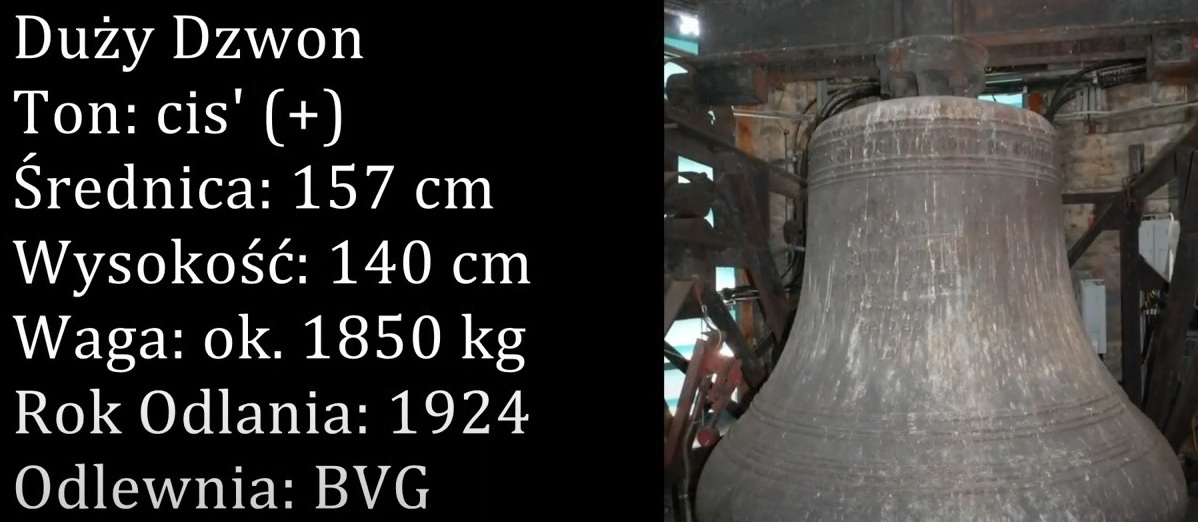 Duży Dzwon. Imię: brak danych. Materiał: staliwo. Ton: cis’. Średnica: 157 cm. Wysokość (z koroną): 140 cm. Wysokość korony: 20 cm. Waga: ok. 1850 kg. Dekoracje (od góry): Korona płytowa: 2 półwałki: Inskrypcje na szyi: - (zapisane niemiecko – gotycką czcionką): Ich beginnt zu klingen in schwerer not zluf dein wort gib gelingen zumamtiger Gott. - z drugiej strony (zwykłą czcionką): Geg. v. Bochumer Verein, Bochum 1924. 3 półwałki: Inskrypcje na płaszczu (zapisane niemiecko – gotycką czionką): O Land Land Land Hore des Herrn Wort. Jer: 22 V 29 +. 4 półwałki. 4 połwałki. Rok Odlania: 1924. Odlewnia: Bochumer Verein.