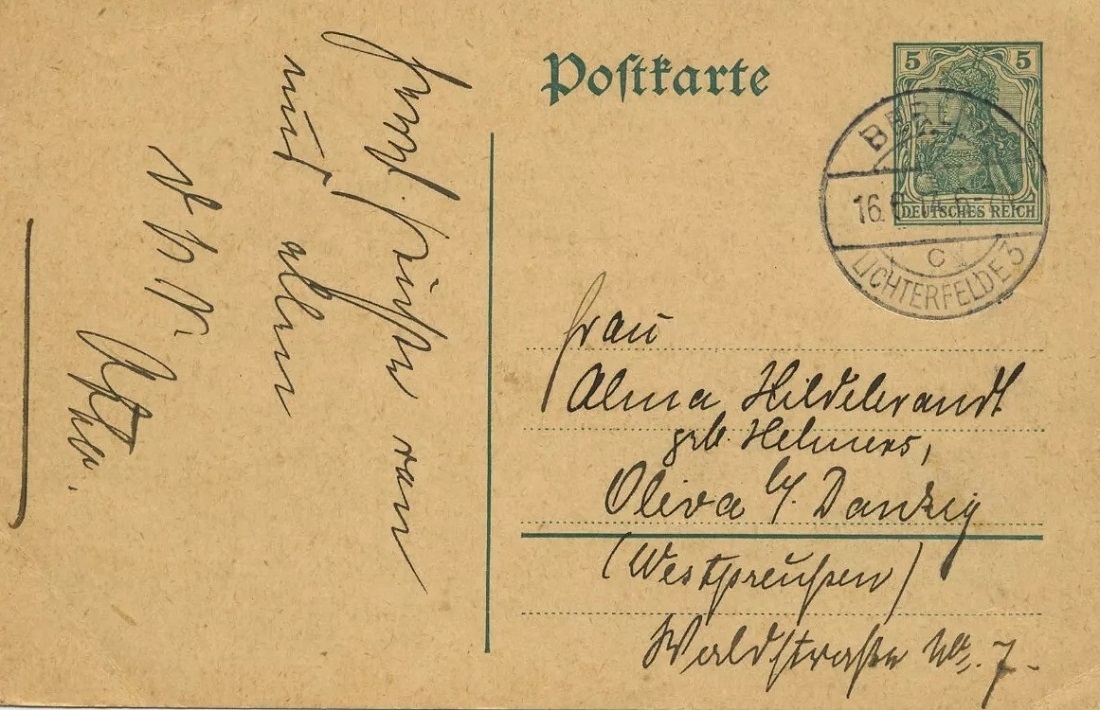 Alma Hildebrand. Całostka wysłana do Oliwy w dn. 16. 08. 1914. Ze strony www.eBay.de.