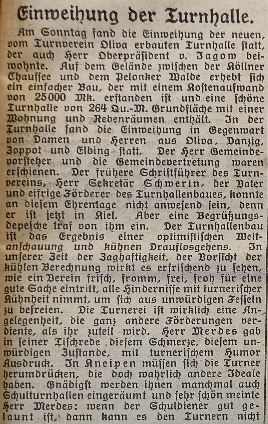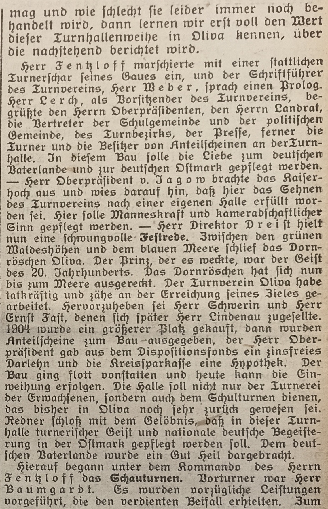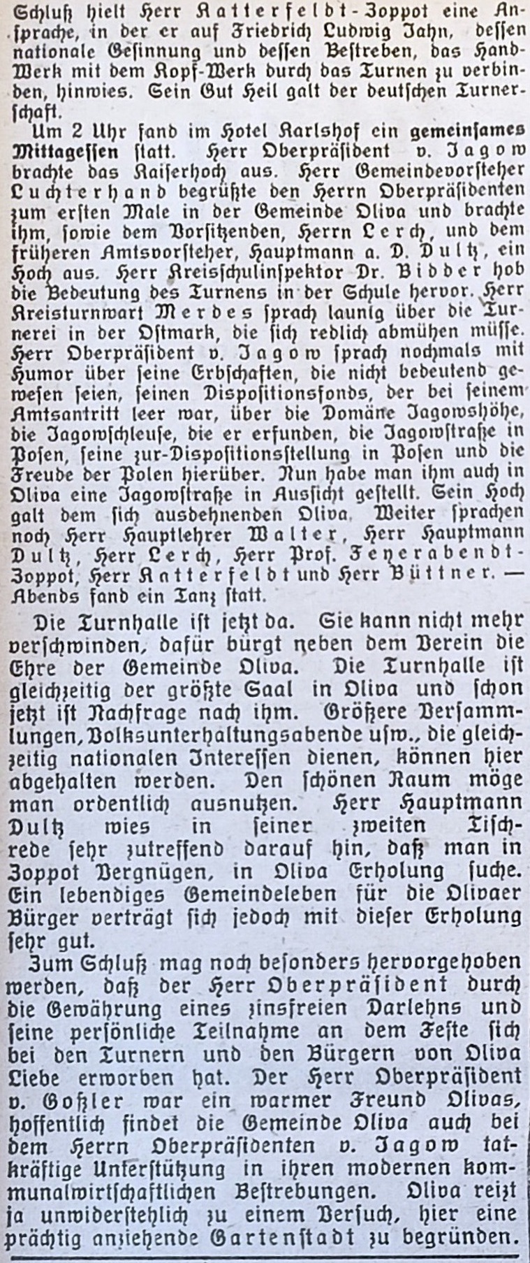 Uroczystosci uswiecono wspolnym obiadem o godz. 4 (tu 14) w hotelu Karlshof, na ktorym byl tez Nadprezydent von Gohler. Nadprezydent byl goracym zwolennikiem Oliwy i poraz pierwszy ja odwiedzil. Przez deklaracje Nadprezydenta, ze gwarantuje bezprocentowy kredyt na budowe zdobyl tym samym serca Oliwiakow. Oliwska Gromada ma nadzieje, ze Nadprezydent v. Jegov czynnie wesprze ja w wysilkach nowoczesnej gospodarki komunalnej. Oliwa dazy do stworzenia wspanialego miasta kwiatow.