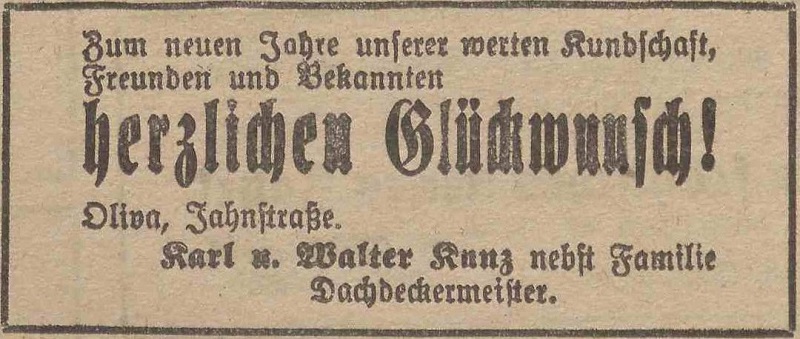 Karl und Walter Kunz, Dachdeckermeister. Podziękowania noworoczne, Olivaer Zeitung nr 306 z 31. 12. 1928.