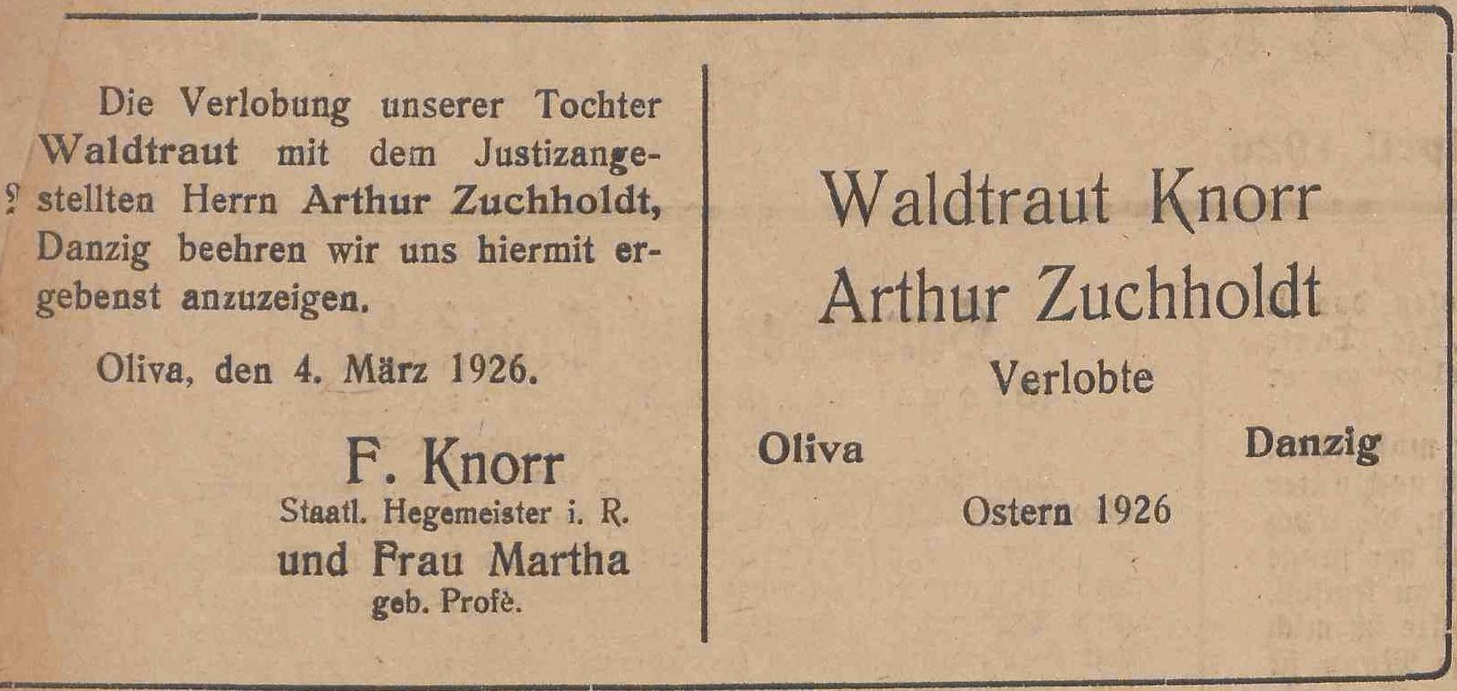 Artur Zuchholdt, Waltraut KInorr, Fredrich Knorr, Martha Knorr zd. Prose. Anzeiger mit der "Olivaer Zeitung", nr 78 z 03. 04. 1926.