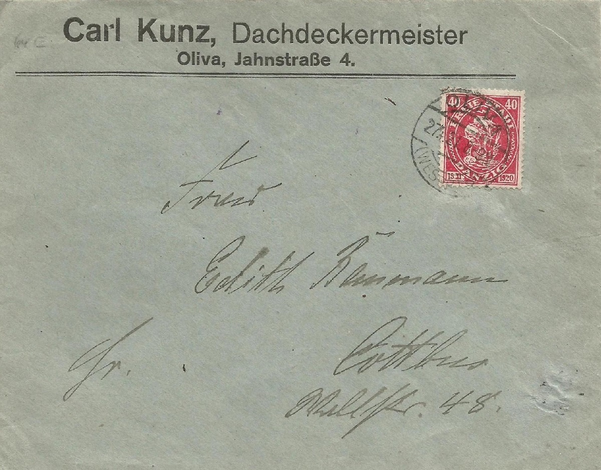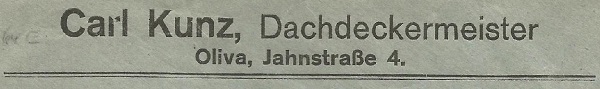 Fragment koperty. Carl Kunz, Dachdeckermeister. Oliwa, Jahnstraße 4. Ze strony Philaseiten.de. Przekazał. Piotr J. Bochyński.