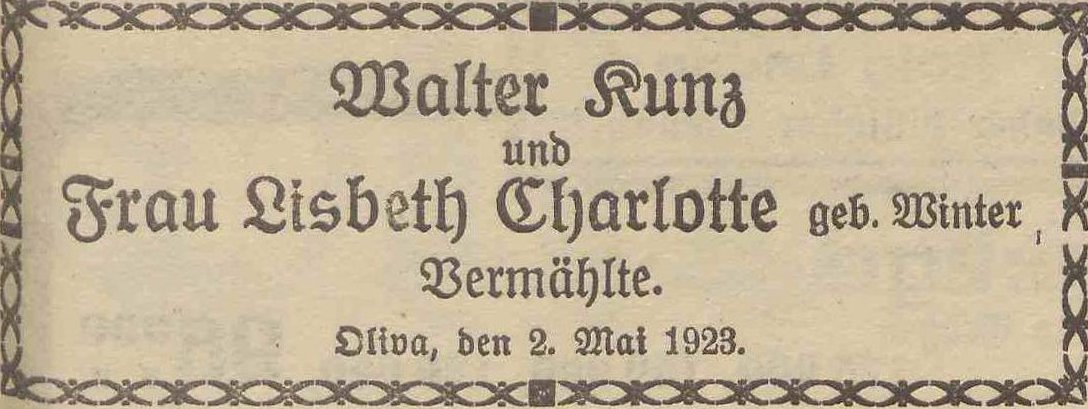 Lisabeth Charlotte Kunz zd. Winter (Am Schloßgarten 8?). Walter Kunz. Olivaer Zeintung nr 101 z 02. 05. 1923 r.