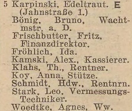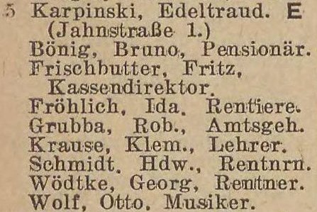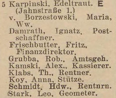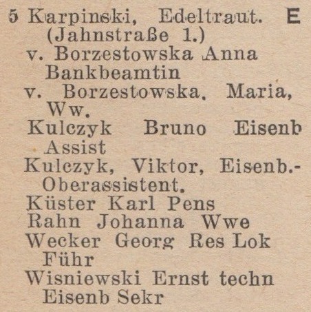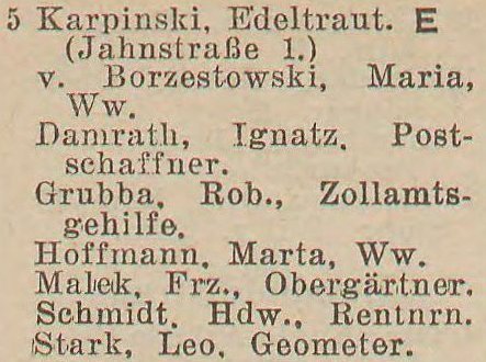 Otto Karpinski (książki aresowe z lat 1916-1942): Hausbesitzer (podnajemca mieszkań w domach do niego należących): Jahnstraße (Liczmańskiego) 1-2, 5, 8 i 17 (16 w 1916 r.), Olivaer Rosengasse (Kwietna) nr 1, 33/35, Am Wächterberg (Podhalańska) nr 11 oraz Waldstraße (Leśna) nr 8.