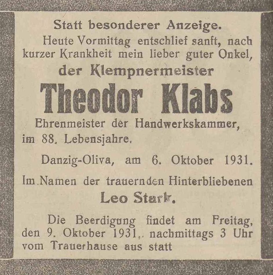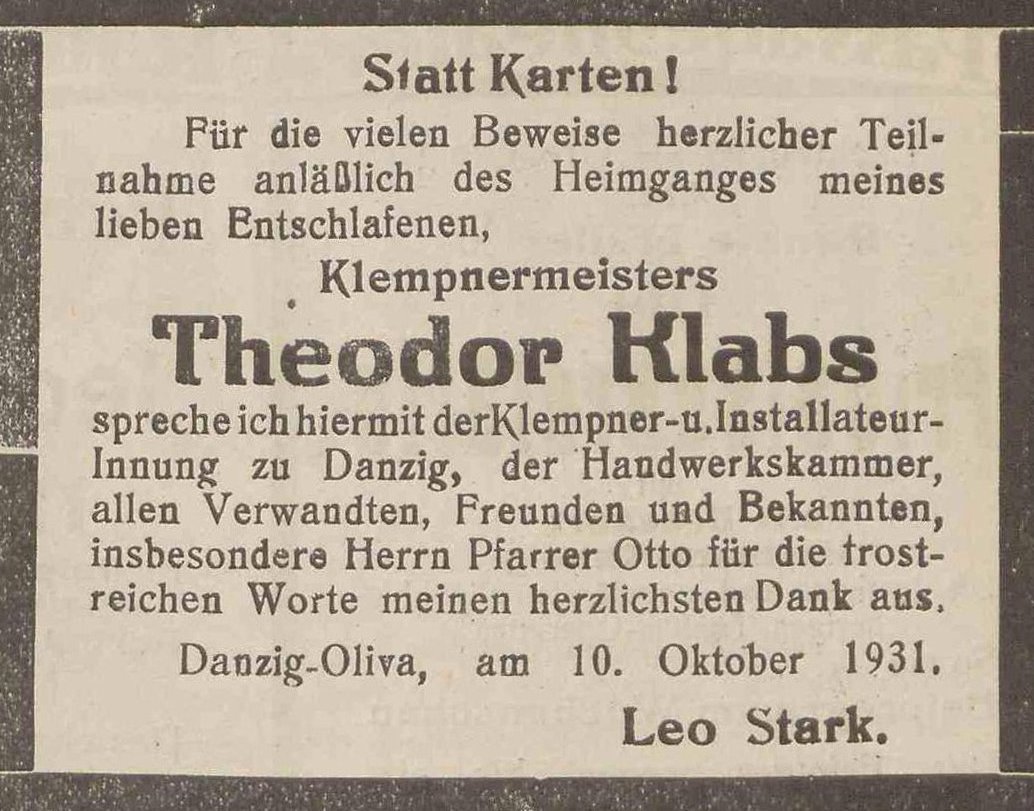 Theodor Klabs. Leo Stark. Danzig-Olivaer Zeintung nr 235 z 07. 10. 1931 r.